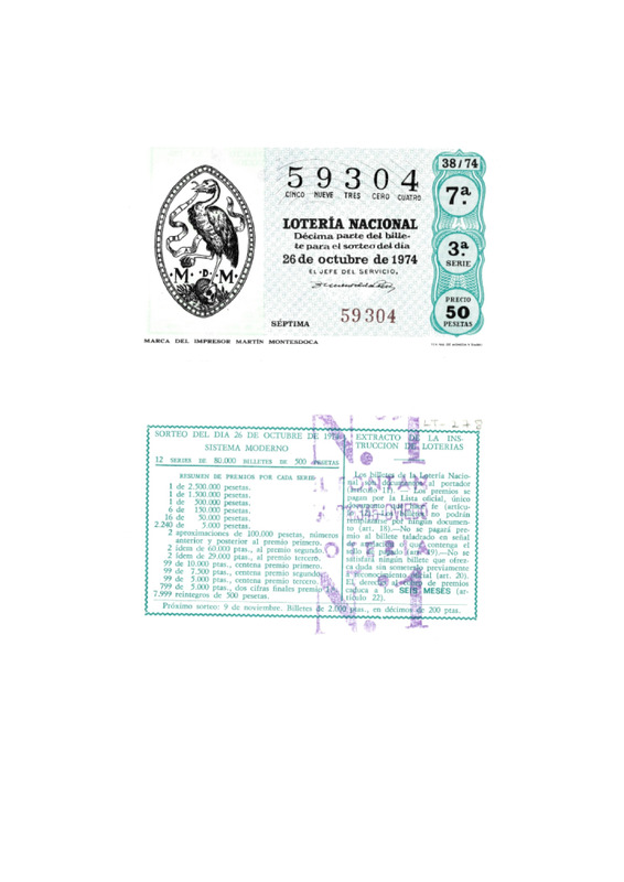 Décimo da Lotaría Nacional de 1974 co motivo "O libro": imaxe que representa a marca do impresor Martín Montesdeoca. O número do décimo é o 59304 / ANVERSO. Impresión / 59304 / Lotería Nacional. Décima parte del billete para el sorteo del día 26 de octubre de 1974 / El jefe del servicio (sinatura) / Séptima / 59304 / 38/74 / 7ª / 3ª serie / Precio 50 pesetas / Marca del impresor Martín Montesdeoca (imaxe) / Fca. Nal. de Moneda y Timbre / REVERSO. Impresión / Sorteo del día 26 de octubre de 1974. Sistema moderno. 12 series de 80.000 billetes de 500 pesetas. (Resumo de premios) / Extracto de la instrucción de Loterías (texto) / Próximo sorteo: 9 de noviembre. Billetes de 2.000 ptas., en décimos de 200 ptas