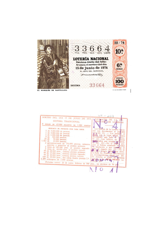 Décimo da Lotaría Nacional de 1974 co motivo "O libro": imaxe que representa ao Marqués de Santillana. O número do décimo é o 33664 / ANVERSO. Impresión / 33664 / Lotería Nacional. Décima parte del billete para el sorteo del día 15 de junio de 1974 / El jefe del servicio (sinatura) / Décima / 33664 / 22/74 / 10ª / 6ª serie / Precio 100 pesetas / El Marqués de Santillana (imaxe) / Fca. Nal. de Moneda y Timbre / REVERSO. Impresión / Sorteo del día 15 de junio de 1974. Sistema tradicional. 9 series de 65.000 billetes de 1.000 pesetas. (Resumo de premios) / Extracto de la instrucción de Loterías (texto) / Próximo sorteo: 22 de junio. Billetes de 500 ptas., en décimos de 50 ptas