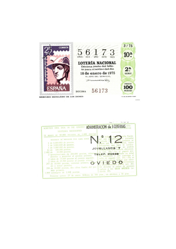 Décimo da Lotaría Nacional de 1975 co motivo "A filatelia": representación dun selo conmemorativo do Día Mundial do Selo de 1967 coa imaxe de "Mercurio mensajero de los dioses". O número do décimo é o 56173 / ANVERSO. Impresión / 56173 / Lotería Nacional. Décima parte del billete para el sorteo del día 18 de enero de 1975 / El jefe del servicio (sinatura) / Décima / 56173 / 3/75 / 10ª / 2ª serie / Precio 100 pesetas / Mercurio mensajero de los dioses (imaxe) / Fca. Nal. de Moneda y Timbre / REVERSO. Impresión / Sorteo del día 18 de enero de 1975. Sistema moderno. 10 series de 80.000 billetes de 1.000 pesetas. (Resumo de premios) / Extracto de la instrucción de Loterías (texto) / Próximo sorteo: 25 de enero. Billetes de 500 ptas., en décimos a 50 ptas