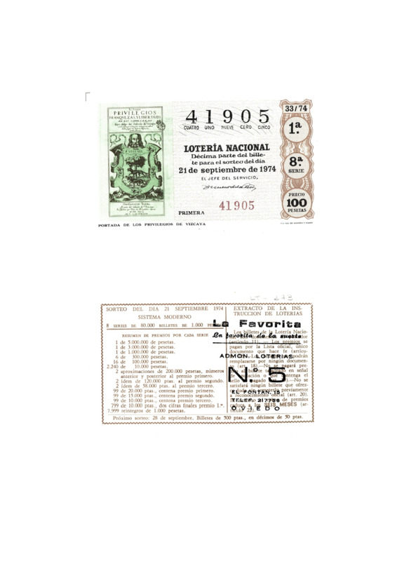 Décimo da Lotaría Nacional de 1974 co motivo "O libro": imaxe que representa a portada dos "Privilegios de Vizcaya". O número do décimo é o 41905 / ANVERSO. Impresión / 41905 / Lotería Nacional. Décima parte del billete para el sorteo del día 21 de septiembre de 1974 / El jefe del servicio (sinatura) / Primera / 41905 / 33/74 / 1ª / 8ª serie / Precio 100 pesetas / Portada de los Privilegios de Vizcaya (imaxe) / Fca. Nal. de Moneda y Timbre / REVERSO. Impresión / Sorteo del día 21 septiembre 1974. Sistema moderno. 8 series de 80.000 billetes de 1.000 pesetas. (Resumo de premios) / Extracto de la instrucción de Loterías (texto) / Próximo sorteo: 28 de septiembre. Billetes de 500 ptas., en décimos de 50 ptas