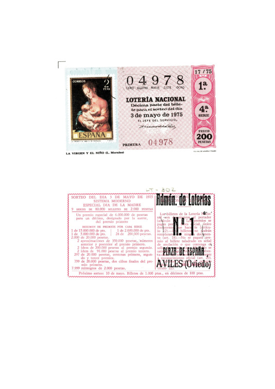 Décimo "Especial do Día da Nai" da Lotaría Nacional de 1975 co motivo "A filatelia: representación dun selo cunha imaxe da obra de Luís de Morales "La Virgen de la leche". O número do décimo é o 04978 / ANVERSO. Impresión / 04978 / Lotería Nacional. Décima parte del billete para el sorteo del día 9 de mayo de 1975 / El jefe del servicio (sinatura) / Primera / 04978 / 17/75 / 1ª / 4ª serie / Precio 200 pesetas / La Virgen y el Niño (L. Morales) (imaxe) / Fca. Nal. de Moneda y Timbre / REVERSO. Impresión / Sorteo del día 3 de mayo de 1975. Sistema moderno. Especial del día de la Madre. 9 series de 80.000 billetes de 2.000 pesetas. (Resumo de premios) / Extracto de la instrucción de Loterías (texto) / Próximo sorteo: 10 de mayo. Billetes de 1.000 ptas., en décimos de 100 ptas
