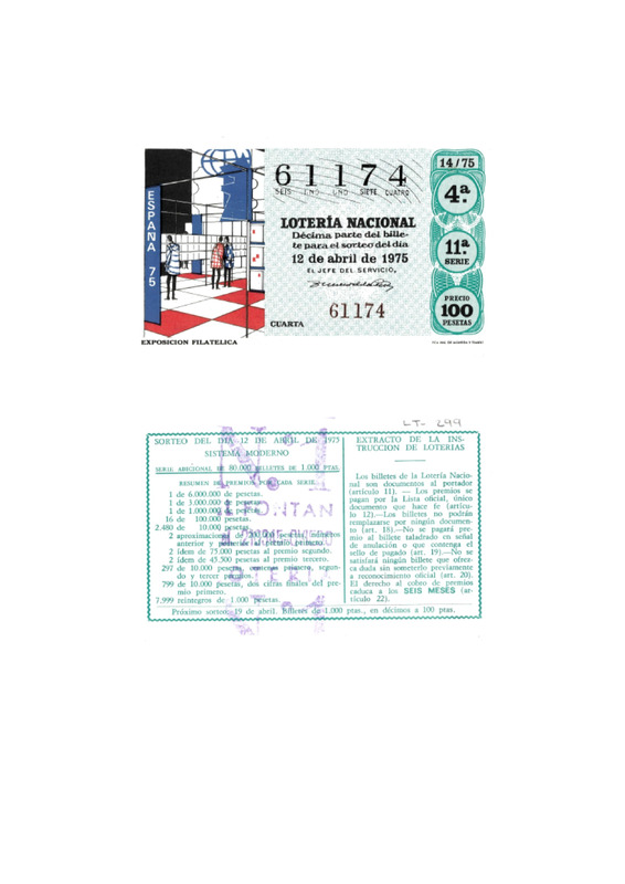 Décimo da Lotaría Nacional de 1975 co motivo "A filatelia": imaxe que representa un cartel da Exposición Mundial de Filatelia de 1975. O número do décimo é o 61174 / ANVERSO. Impresión / 61174 / Lotería Nacional. Décima parte del billete para el sorteo del día 12 de abril de 1975 / El jefe del servicio (sinatura) / Cuarta / 61174 / 14/75 / 4ª / 11ª serie / Precio 100 pesetas / Exposición filatélica (imaxe) / Fca. Nal. de Moneda y Timbre / REVERSO. Impresión / Sorteo del día 12 de abril de 1975. Sistema moderno. Serie adicional de 80.000 billetes de 1.000 ptas. (Resumo de premios) / Extracto de la instrucción de Loterías (texto) / Próximo sorteo: 19 de abril. Billetes de 1.000 ptas., en décimos de 100 ptas