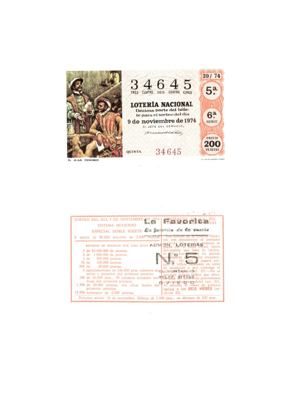 Décimo "Especial Dobre Sorte" da Lotaría Nacional de 1974 co motivo "O libro": imaxe dunha representación do Don Xoan Tenorio. O número do décimo é o 34645 / ANVERSO. Impresión / 34645 / Lotería Nacional. Décima parte del billete para el sorteo del día 9 de noviembre / El jefe del servicio (sinatura) / Quinta / 34645 / 39/74 / 5ª / 6ª serie / Precio 200 pesetas / D. Juan Tenorio (imaxe) / Fca. Nal. de Moneda y Timbre / REVERSO. Impresión / Sorteo del día 9 de noviembre de 1974. Sistema moderno. Especial dobre sorte. 8 series de 80.000 billetes de 2.000 pesetas. (Resumo de premios) / Extracto de la instrucción de Loterías (texto) / Próximo sorteo: 16 de noviembre. Billetes de 1.000 ptas., en décimos de 100 ptas