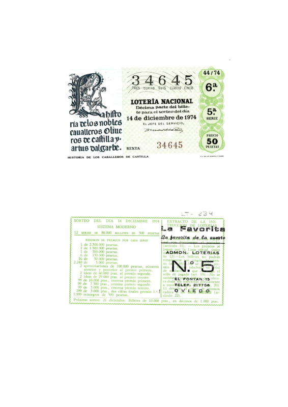 Décimo da Lotaría Nacional de 1974 co motivo "O libro": imaxe que representa un fragmento da "Historia de los muy Nobles Caballeros Oliveros de Castilla y Artus de Algarve y de sus maravillosas y grandes hazañas" composta polo bacharel Pedro da Floresta. O número do décimo é o 34645 / ANVERSO. Impresión / 34645 / Lotería Nacional. Décima parte del billete para el sorteo del día 14 de diciembre de 1974 / El jefe del servicio (sinatura) / Sexta / 34645 / 44/74 / 6ª / 5ª serie / Precio 50 pesetas / Historia de los Caballeros de Castilla (imaxe) / Fca. Nal. de Moneda y Timbre / REVERSO. Impresión / Sorteo del día 14 diciembre 1974. Sistema moderno. 12 series de 80.000 billetes de 500 pesetas. (Resumo de premios) / Extracto de la instrucción de Loterías (texto) / Próximo sorteo: 21 diciembre. Billetes de 10.000 ptas., en décimos de 1.000 ptas