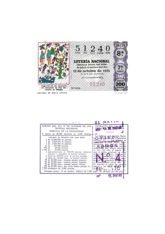 Décimo "Especial do Día da Hispanidade" da Lotaría Nacional de 1974 co motivo "O libro": imaxe que representa un fragmento dunha ilustración do manuscrito de Frei Bernardino de Sahagún "Historia General de las cosas de Nueva España". O número do décimo é o 51240 / ANVERSO. Impresión / 51240 / Lotería Nacional. Décima parte del billete para el sorteo del día 12 de octubre de 1974 / El jefe del servicio (sinatura) / Octava / 51240 / 36/74 / 8ª / 7ª serie / Precio 200 pesetas / Historia de Nueva España (imaxe) / Fca. Nal. de Moneda y Timbre / REVERSO. Impresión / Sorteo del día 12 de octubre de 1974. Sistema moderno. Especial de la Hispanidad. 8 series de 80.000 billetes de 2.000 pesetas. (Resumo de premios) / Extracto de la instrucción de Loterías (texto) / Próximo sorteo: 19 de octubre. Billetes de 1.000 ptas., en décimos de 100 ptas