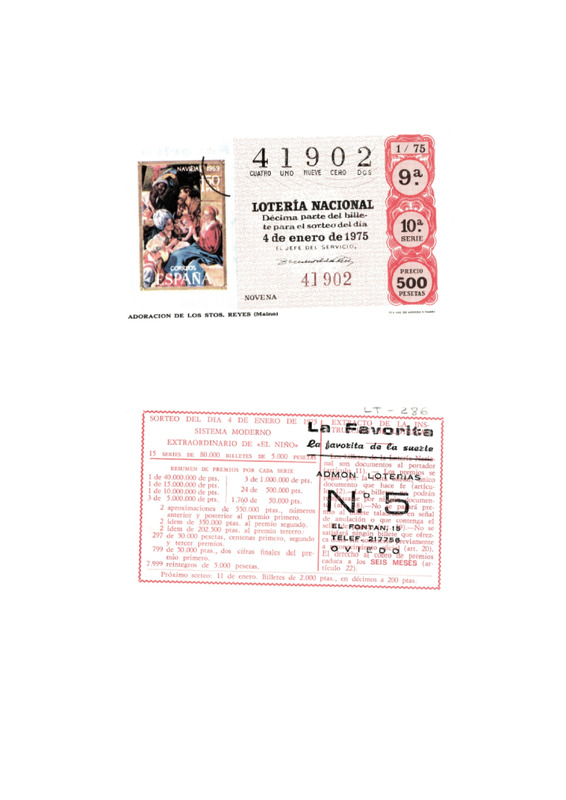 Décimo "Extraordinario do Día do Neno" da Lotaría Nacional de 1975 co motivo "A filatelia": representa un selo de 1969 cunha imaxe do cadro "Adoración de los Santos Reyes Magos" de Juan Bautista Maíno. O número do décimo é o 41902 / ANVERSO. Impresión / 41902 / Lotería Nacional. Décima parte del billete para el sorteo del día 4 de enero de 1975 / El jefe del servicio (sinatura) / Novena / 41902 / 1/75 / 9ª / 10ª serie / Precio 500 pesetas / Adoración de los Stos. Reyes (Maíno) (imaxe) / Fca. Nal. de Moneda y Timbre / REVERSO. Impresión / Sorteo del día 4 de enero de 1975. Sistema moderno. Extraordinario de "El Niño". 15 series de 80.000 billetes de 5.000 pesetas. (Resumo de premios) / Extracto de la instrucción de Loterías (texto) / Próximo sorteo: 11 de enero. Billetes de 2.000 ptas., en décimos a 200 ptas