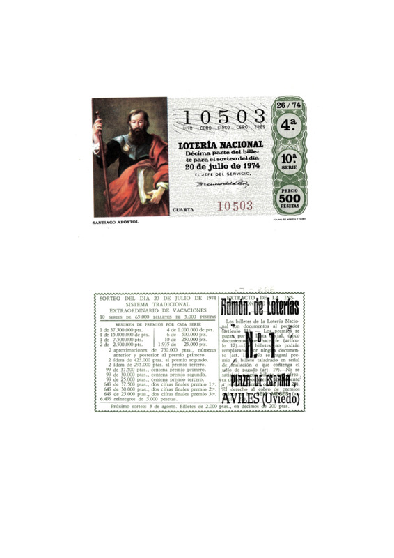 Décimo "Extraordinario de Vacacións" da Lotaría Nacional de 1974 co motivo "O libro": imaxe que representa a Santiago Apóstol. O número do décimo é o 10503 / ANVERSO. Impresión / 10503 / Lotería Nacional. Décima parte del billete para el sorteo del día 20 de julio de 1974 / El jefe del servicio (sinatura) / Cuarta / 10503 / Lotería Nacional. Décima parte del billete para el sorteo del día 20 de julio de 1974 / El jefe del servicio (sinatura) / 26/74 / 4ª / 10ª serie / Precio 500 pesetas / Santiago Apóstol (imaxe) / Fca. Nal. de Moneda y Timbre / REVERSO. Impresión / Sorteo del día 20 de julio de 1974. Sistema tradicional. Extraordinario de vacaciones. 10 series de 65.000 billetes de 5.000 pesetas. (Resumo de premios) / Extracto de la instrucción de Loterías (texto) / Próximo sorteo: 3 de agosto. Billetes de 2.000 ptas., en décimos de 200 ptas
