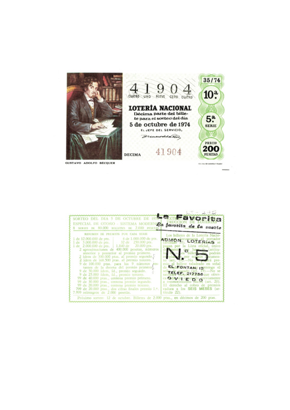 Décimo "Especial de Outono" da Lotaría Nacional de 1974 co motivo "O libro": imaxe que representa un retrato de Gustavo Adolfo Becquer. O número do décimo é o 41904 / ANVERSO. Impresión / 41904 / Lotería Nacional. Décima parte del billete para el sorteo del día 5 de octubre de 1974 / El jefe del servicio (sinatura) / Décima / 41904 / 35/74 / 10ª / 5ª serie / Precio 200 pesetas / Gustavo Adolfo Becker (imaxe) / Fca. Nal. de Moneda y Timbre / REVERSO. Impresión / Extracto de la instrucción de Loterías (texto) / Próximo sorteo: 12 de octubre. Billetes de 2.000 ptas., en décimos de 200 ptas