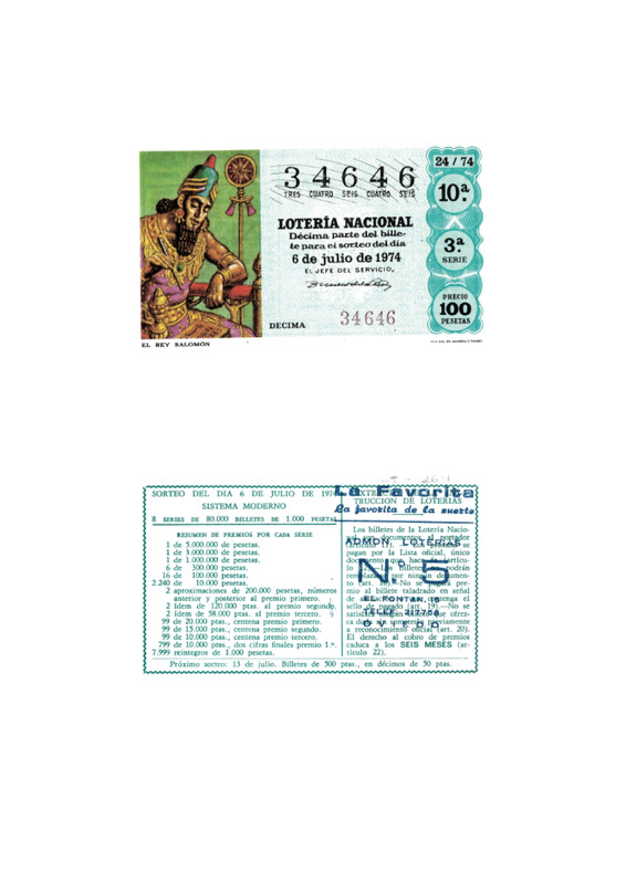 Décimo da Lotaría Nacional de 1974 co motivo "O libro": imaxe que representa o Rei Salomón. O número do décimo é o 34646 / ANVERSO. Impresión / 34646 / Lotería Nacional. Décima parte del billete para el sorteo del día 6 de julio de 1974 / El jefe del servicio (sinatura) / Décima / 34646 / 24/74 / 10ª / 3ª serie / Precio 100 pesetas / El Rey Salomón (imaxe) / Fca. Nal. de Moneda y Timbre / REVERSO. Impresión / Sorteo del día 6 de julio de 1974. Sistema moderno. 8 series de 80.000 billetes de 1.000 pesetas. (Resumo de premios) / Extracto de la instrucción de Loterías (texto) / Próximo sorteo: 13 de julio. Billetes de 500 ptas., en décimos de 50 ptas