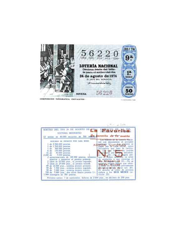 Décimo da Lotaría Nacional de 1974 co motivo "O libro": imaxe que representa un "chibalete", unha composición tipográfica. O número do décimo é o 56220 / ANVERSO. Impresión / 56220 / Lotería Nacional. Décima parte del billete para el sorteo del día 24 de agosto de 1974 / El jefe del servicio (sinatura) / Novena / 56220 / 30/74 / 9ª / 1ª serie / Precio 50 pesetas / Composición tipográfica. Chivaletes (imaxe) / Fca. Nal. de Moneda y Timbre / REVERSO. Impresión / Sorteo del día 24 de agosto de 1974. Sistema moderno. 12 series de 80.000 billetes de 500 pesetas. (Resumo de premios) / Extracto de la instrucción de Loterías (texto) / Próximo sorteo: 7 de septiembre. Billetes de 2.000 ptas., en décimos de 200 ptas