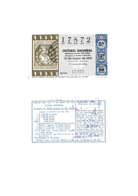 Décimo da Lotaría Nacional de 1975 co motivo "A filatelia":representación dun selo correo interior de Madrid con cuño de parrilla. O número do décimo é o 17872 / ANVERSO. Impresión / 17872 / Lotería Nacional. Décima parte del billete para el sorteo del día 31 de mayo de 1975 / El jefe del servicio (sinatura) / Quinta / 17872 / 21/75 / 5ª / 12ª serie / Precio 50 pesetas / Sello correo interior de Madrid (con matasellos de parrilla) (imaxe) / Fca. Nal. de Moneda y Timbre / REVERSO. Impresión / Sorteo del día 31 de mayo de 1975. Sistema moderno. 16 series de 80.000 billetes de 500 pesetas. (Resumo de premios) / Extracto de la instrucción de Loterías (texto) / Próximo sorteo: 7 de junio. Billetes de 2.500 ptas., en décimos de 250 ptas