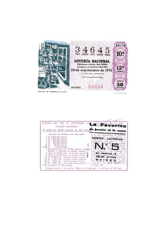 Décimo da Lotaría Nacional de 1974 co motivo "O libro": imaxe que representa un obradoiro de imprenta do s. XVI. O número do décimo é o 34645 / ANVERSO. Impresión / 34645 / Lotería Nacional. Décima parte del billete para el sorteo del día 28 de septiembre de 1974 / El jefe del servicio (sinatura) / Décima / 34645 / 34/74 / 10ª / 12ª serie / Precio 50 pesetas / Taller de imprenta s. XVI (imaxe) / Fca. Nal. de Moneda y Timbre / REVERSO. Impresión / Sorteo del día 28 septiembre 1974. Sistema moderno. 12 series de 80.000 billetes de 500 pesetas. (Resumo de premios) / Extracto de la instrucción de Loterías (texto) / Próximo sorteo: 5 de octubre. Billetes de 2.000 ptas., en décimos de 200 ptas