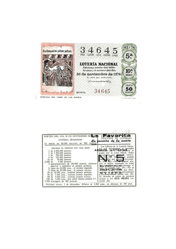 Décimo da Lotaría Nacional de 1974 co motivo "O libro": imaxe que representa a portada do "Libro de los Sueños". O número do décimo é o 34645 / ANVERSO. Impresión / 34645 / Lotería Nacional. Décima parte del billete para el sorteo del día 30 de noviembre de 1974 / El jefe del servicio (sinatura) / Quinta / 34645 / 42/74 / 5ª / 10ª serie / Precio 50 pesetas / Portada del Libro de los Sueños (imaxe) / Fca. Nal. de Moneda y Timbre / REVERSO. Impresión / Sorteo del día 30 de nvoiembre de 1974. Sistema moderno. 12 series de 80.000 billetes de 500 pesetas. (Resumo de premios) / Extracto de la instrucción de Loterías (texto) / Próximo sorteo: 7 de diciembre. Billetes de 1.000 ptas., en décimos de 100 ptas