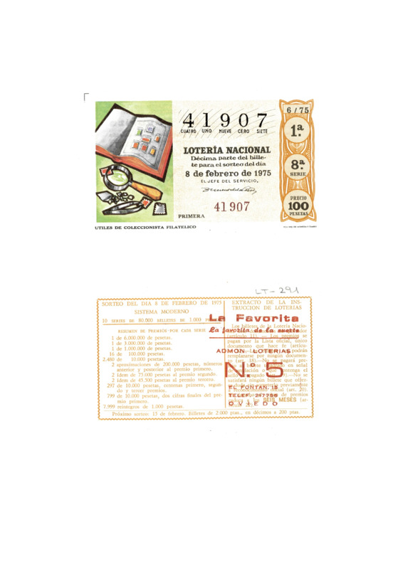 Décimo da Lotaría nacional de 1975 co motivo "A filatelia": imaxe que representa útiles de coleccionista filatélico. O número do décimo é o 41907 / ANVERSO. Impresión / 41907 / Lotería Nacinal. Décima parte del billete para el sorteo del día 8 de febrero de 1975 / El jefe del servicio (sinatura) / Primera / 41907 / 6/75 / 1ª / 8ª serie / Precio 100 pesetas / Útiles de coleccionista filatélico (imaxe) / Fca. Nal. de Moneda y Timbre / REVERSO. Impresión / Sorteo del día 8 de febrero de 1975. Sistema moderno. 10 series de 80.000 billetes de 1.000 pesetas. (Resumo de premios) / Extracto de la instrucción de Loterías (texto) / Próximo sorteo: 15 de febrero. Billetes de 2.000 ptas., en décimos a 200 ptas