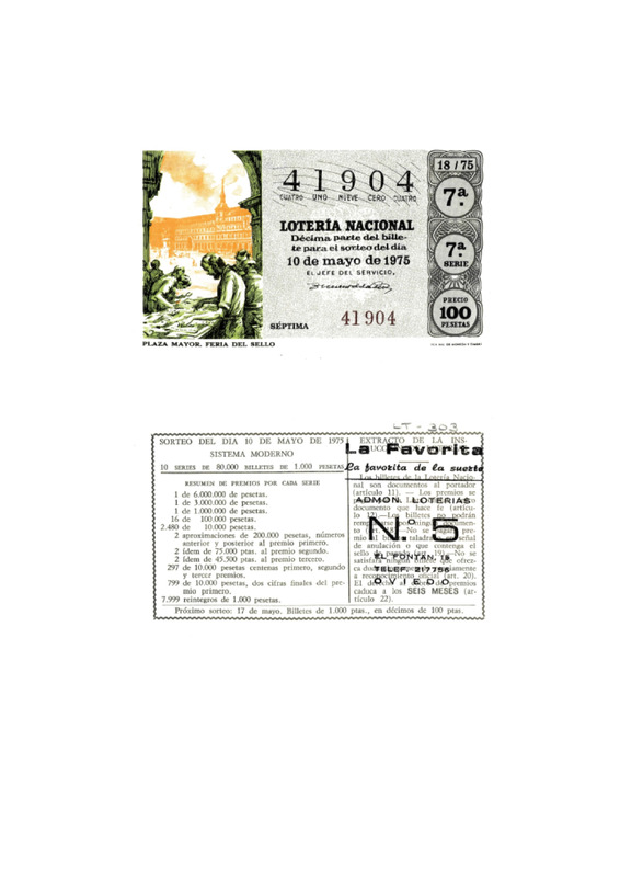 Décimo da Lotaría Nacional de 1975 co motivo "A filatelia": imaxe que representa a Feira do Selo na Praza Maior de Madrid. O número do décimo é o 41904 / ANVERSO. Impresión / 41904 / Lotería Nacional. Décima parte del billete para el sorteo del día 10 de mayo de 1975 / El jefe del servicio (sinatura) / Séptima / 41904 / 18/75 / 7ª / 7ª serie / Precio 100 pesetas / Plaza Mayor. Feria del Sello (imaxe) / Fca. Nal. de Moneda y Timbre / REVERSO. Sorteo del día 10 de mayo de 1975. Sistema moderno. 10 series de 80.000 billetes de 1.000 pesetas. (Resumo de premios) / Extracto de la instrucción de Loterías (texto) / Próximo sorteo: 17 de mayo. Billetes de 1.000 ptas., en décimos de 100 ptas