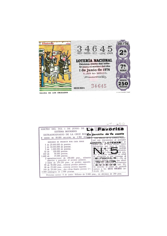 Décimo "Extraordinario da Cruz Vermella" da Lotaría Nacional de 1974 co motivo "O libro": imaxe que representa unha ilustración da saída dos cruzados. O número do décimo é o 34645 / ANVERSO. Impresión / 34645 / Lotería Nacional. Décima parte del billete para el sorteo del día 1 de junio de 1974 / El jefe del servicio (sinatura) / Segunda / 34645 / 20/74 / 2ª / 7ª serie / Precio 250 pesetas / Salida de los cruzados (imaxe) / Fca. Nal. de Moneda y Timbre / REVERSO. Impresión / Sorteo del día 1 de junio de 1974. Sistema moderno. Extraordinario de la Cruz Roja. 8 series de 80.000 billetes de 2.500 pesetas. (Resumo de premios) / Extracto de la instrucción de Loterías (texto) / Próximo sorteo: 8 de junio. Billetes de 2.000 ptas., en décimos de 200 ptas