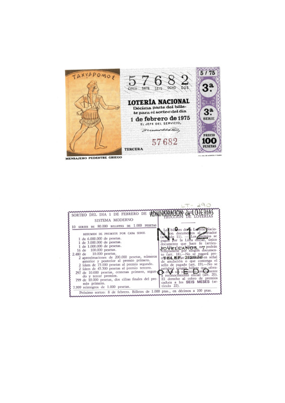 Décimo da Lotaría Nacional de 1975 co motivo "A filatelia": imaxe que representa un mensaxeiro pedestre grego. O número do décimo é o 57682 / ANVERSO. Impresión / 57682 / Lotería Nacional. Décima parte del billete para el sorteo del día 1 de febrero de 1975 / El jefe del servicio (sinatura) / Tercera / 57682 / 5/75 / 3ª / 3ª serie / Precio 100 pesetas / Mensajero pedestre griego (imaxe) / Fca. Nal. de Moneda y Timbre / REVERSO. Impresión / Sorteo del día 1 de febrero de 1975. Sistema moderno. 10 series de 80.000 billetes de 1.000 pesetas. (Resumo de premios) / Extracto de la instrucción de Loterías (texto) / Próximo sorteo: 8 de febrero. Billetes de 1.000 ptas., en décimos a 100 ptas