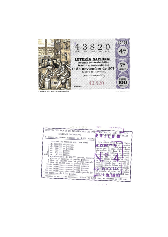 Décimo da Lotaría Nacional de 1974 co motivo "O libro": imaxe que representa un obradoiro de encadernación. O número do décimo é o 43820 / ANVERSO. Impresión / 43820 / Lotería Nacional. Décima parte del billete para el sorteo del día 16 de noviembre de 1974 / El jefe del servicio (sinatura) / Cuarta / 43820 / 40/74 / 4ª / 7ª serie / Precio 100 pesetas / Taller de encuadernación (imaxe) / Fca. Nal. de Moneda y Timbre / REVERSO. Impresión / Sorteo del día 16 de noviembre de 1974. Sistema moderno. 8 series de 80.000 billetes de 1.000 pesetas. (Resumo de premios) / Extracto de la instrucción de Loterías (texto) / Próximo sorteo: 23 de noviembre. Billetes de 1.000 ptas., en décimos de 100 ptas