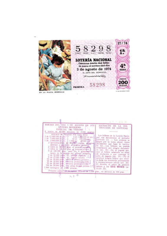 Décimo "Especial de Verán" da Lotaría Nacional de 1974 co motivo "O libro": imaxe que representa un fragmento da obra "En la playa" de Joaquín Sorolla. O número do décimo é o 58298 / ANVERSO. Impresión / 58298 / Lotería Nacional. Décima parte del billete para el sorteo del día 3 de agosto de 1974 / El jefe del servicio (sinatura) / Primera / 58298 / 27/74 / 1ª / 4ª serie / Precio 200 pesetas / En la playa (Sorolla) (imaxe) / Fca. Nal. de Moneda y Timbre / REVERSO. Impresión / Sorteo del día 3 de agosto de 1974. Sistema moderno. Especial de verano. 8 series de 80.000 billetes de 2.000 pesetas. (Resumo de premios) / Extracto de la instrucción de Loterías (texto) / Próximo sorteo: 10 de agosto. Billetes de 1.000 ptas., en décimos de 100 ptas