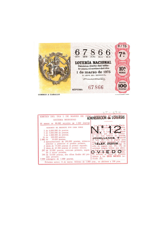Décimo da Lotaría Nacional de 1975 co motivo "A filatelia": imaxe que representa unha figura dun correo a cabalo. O número do décimo é o 67866 / ANVERSO. Impresión / 67866 / Lotería Nacional / Décima parte del billete para el sorteo del día 1 de marzo de 1975 / El jefe del servicio (sinatura) / Séptima / 67866 / 9/75 / 7ª / 10ª serie / Precio 100 pesetas / Correo a caballo (imaxe) / Fca. Nal. de Moneda y Timbre / REVERSO. Impresión / Sorteo del día 1 de marzo de 1975. Sistema moderno. 10 series de 80.000 billetes de 1.000 pesetas. (Resumo de premios) / Extracto de la instrucción de Loterías (texto) / Próximo sorteo: 8 de marzo. Billetes de 1.000 ptas., en décimos a 100 ptas