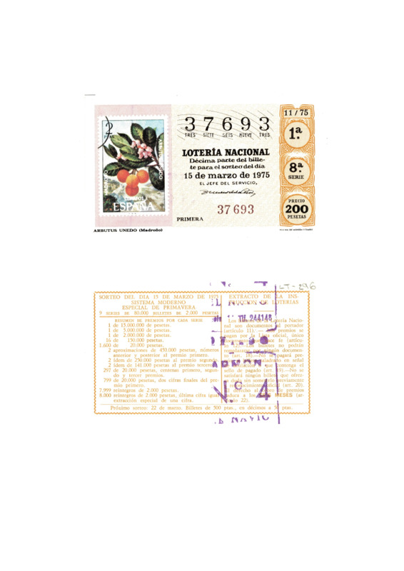 Décimo da Lotaría Nacional de 1975 co motivo "A filatelia":representación dun selo cunha imaxe dun "arbutus unedo" (érbedo). O número do décimo é o 37693 / ANVERSO. Impresión / 37693 / Lotería Nacional. Décima parte del billete para el sorteo del día 15 de marzo de 1975 / El jefe del servicio (sinatura) / Primera / 37693 / 11/75 / 1ª / 8ª serie / Precio 200 pesetas / Arbutus unedo (madroño) / Fca. Nal. de Moneda y Timbre / REVERSO. Impresión / Sorteo del día 15 de marzo de 1975. Sistema moderno. Especial de primavera. 9 series de 80.000 billetes de 2.000 pesetas. (Resumo de premios) / Extracto de la instrucción de Loterías (texto) / Próximo sorteo: 22 de marzo. Billetes de 500 ptas., en décimos a 50 ptas