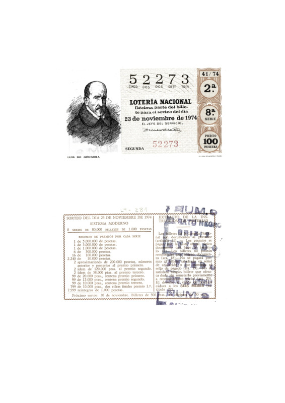 Décimo da Lotaría Nacional de 1974 co motivo "O libro": imaxe que representa un retrato de Luís de Góngora. O número do décimo é o 52273 / ANVERSO. Impresión / 52273 / Lotería Nacional. Décima parte del billete para el sorteo del día 23 de noviembre de 1974 / El jefe del servicio (sinatura) / Segunda / 52273 / 41/74 / 2ª / 8ª serie / Precio 100 pesetas / Luís de Góngora (imaxe) / Fca. Nal. de Moneda y Timbre / REVERSO. Impresión / Sorteo del día 23 de noviembre de 1974. Sistema moderno. 8 series de 80.000 billetes de 1.000 pesetas. (Resumo de premios) / Extracto de la instrucción de Loterías (texto) / Próximo sorteo: 30 de noviembre. Billetes de 500 ptas., en décimos de 50 ptas