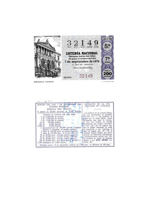 Décimo "Especial do Turista" da Lotaría Nacional de 1974 co motivo "O libro": imaxe que representa a Biblioteca Nacional. O número do décimo é o 32149 / ANVERSO. Impresión / 32149 / Lotería Nacional. Décima parte del billete para el sorteo del día 7 de septiembre de 1974 / El jefe del servicio (sinatura) / Quinta / 32149 / 31/74 / 5ª / 7ª serie / Precio 200 pesetas / Biblioteca Nacional (imaxe) / Fca. Nal. de Moneda y Timbre / REVERSO. Impresión / Sorteo del día 7 de septiembre de 1974. Sistema moderno. Especial del turista. 8 series de 80.000 billetes de 2.000 pesetas. (Resumo de premios) / Extracto de la instrucción de Loterías (texto) / Próximo sorteo: 14 de septiembre. Billetes de 1.000 ptas., en décimos de 100 ptas