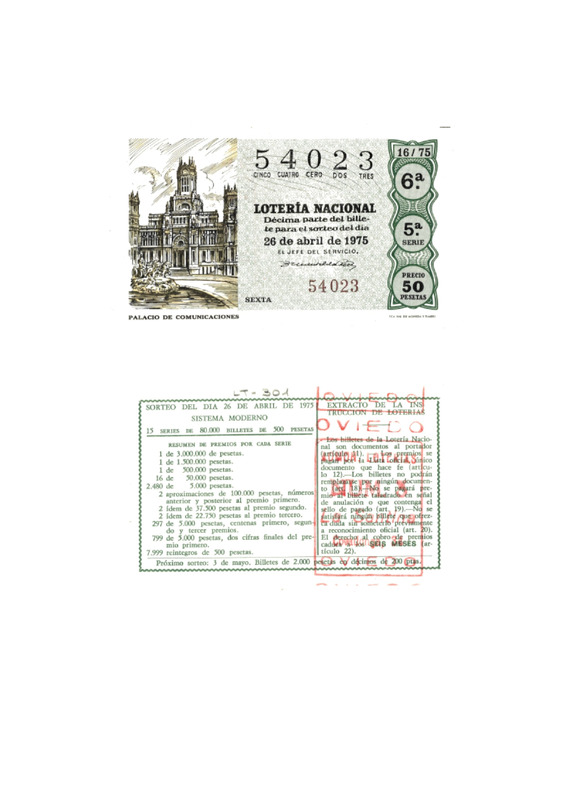 Décimo da Lotaría Nacional de 1975 co motivo "A filatelia": imaxe que representa o Pazo de Comunicacións de Madrid. O número do décimo é o 54023 / ANVERSO. Impresión / 54023 / Lotería Nacional. Décima parte del billete para el sorteo del día 26 de abril de 1975 / El jefe del servicio (sinatura) / Sexta / 54023 / 16/75 / 6ª / 5ª serie / precio 50 pesetas / Palacio de Comunicaciones (imaxe) / Fca. Nal. de Moneda y Timbre / REVERSO. Impresión / Sorteo del día 26 de abril de 1975. Sistema moderno. 15 series de 80.000 billetes de 500 pesetas. (Resumo de premios) / Extracto de la instrucción de Loterías (texto) / Próximo sorteo: 3 de mayo. Billetes de 2.000 pesetas en décimos de 200 ptas