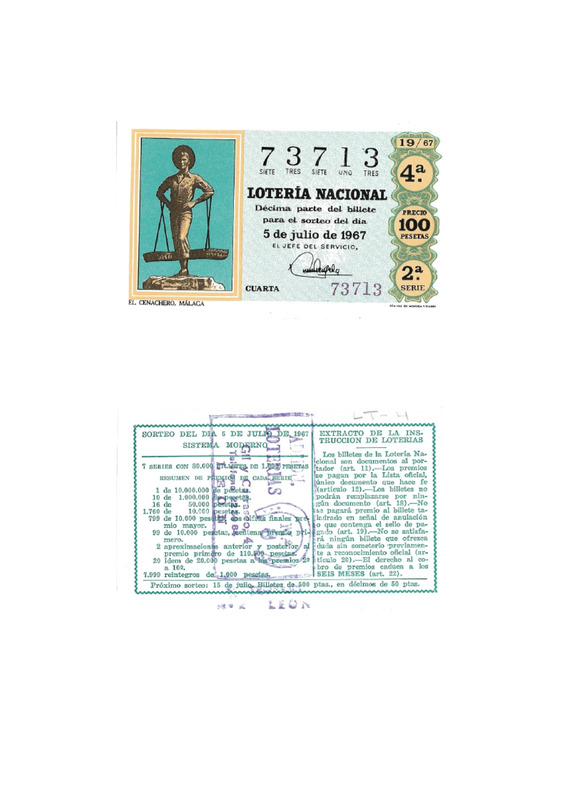 Décimo da Lotaría Nacional de 1967 co motivo "A Escultura española": imaxe da escultura "El Cenachero", de Málaga, realizada en bronce por Jaime Fernández Pimentel en 1968. Representa un personaxe popular de Málaga, vendedor de peixe nas rúas da cidade. Aparece representado mantendo o equilibrio entre os dous platos de cenachos, de aí o seu nome. O número do décimo é o 73713 / ANVERSO. Impresión / 73713 / Lotería Nacional / Décima parte del billete para el sorteo del día 5 de julio de 1967 / El jefe del servicio (sinatura) / Cuarta / 73713 / 19/67 / 4ª / Precio 100 pesetas / 2ª serie / El Cenachero, Málaga (imaxe) / Fca. Nal. de Moneda y Timbre / REVERSO. Impresión / Sorteo del día 5 de julio de 1967. Sistema moderno. 7 series con 80.000 billetes de 1.000 pesetas. (Resumo de premios) / Extracto de la instrucción de Loterías (texto) / Próximo sorteo: 15 de julio. Billetes de 500 ptas., en décimos de 50 ptas