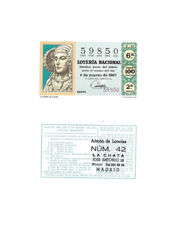 Décimo da Lotaría Nacional de 1967 co motivo "A Escultura española": efixie da "Dama de Elxe". O número do décimo é o 59850 / ANVERSO. Impresión / 59850 / Lotería Nacional / Décima parte del billete para el sorteo del día 6 de marzo de 1967 / El jefe del servicio (sinatura) / Sexta / 59850 / 7/67 / 6ª / Precio 100 pesetas / 2ª serie / La Dama de Elche (imaxe) / Fca. Nal. de Moneda y Timbre / REVERSO. Impresión / Sorteo del día 6 de marzo de 1967. Sistema moderno. 7 series con 60.000 billetes de 1.000 pesetas. (Resumo de premios) / Extracto de la instrucción de Loterías (texto) / Próximo sorteo: 15 de marzo. Billetes de 500 ptas., en décimos de 50 ptas