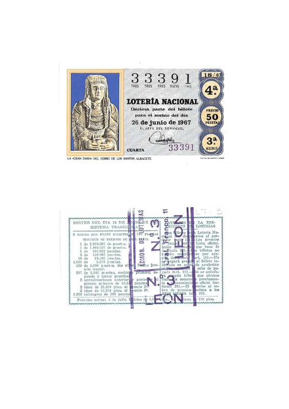 Décimo da Lotaría Nacional de 1967 co motivo "A Escultura española": imaxe da "Gran Dama" do Cerro de los Santos, Albacete. O número do décimo é o 33391 / ANVERSO. Impresión / 33391 / Lotería Nacional / Décima parte del billete para el sorteo del día 26 de junio de 1967 / El jefe del servicio (sinatura) / Cuarta / 33391 / 18/67 / 4ª / Precio 50 pesetas / 3ª serie / "La "Gran Dama" del Cerro de los Santos, Albacete (imaxe) / Fca. Nal. de Moneda y Timbre / REVERSO. Impresión / Sorteo del día 26 de junio de 1967. Sistema Tradicional. 8 series con 60.000 billetes de 500 pesetas (Resumo de premios) / Extracto de la instrucción de Loterías (texto) / Próximo sorteo: 5 de julio. Billetes de 1.000 ptas., en décimos de 100 ptas