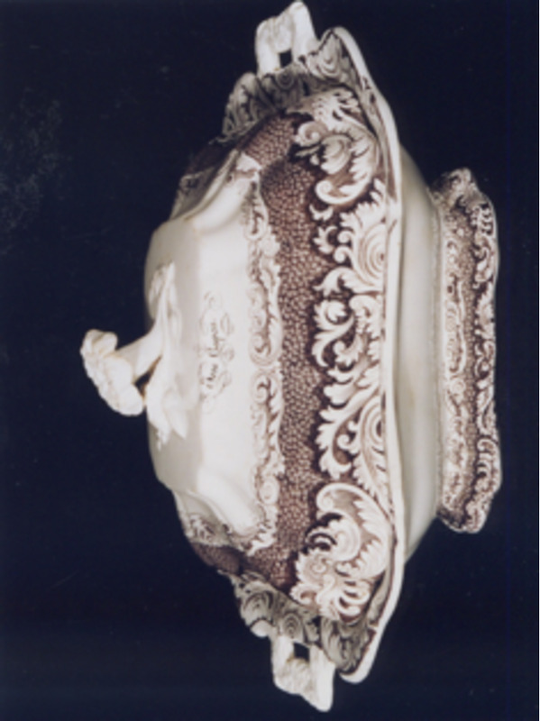 Fonte fonda de forma octogonal con pé alto e dúas asas laterais labiadas con motivos vexetais en relevo. A tapadeira presente no vértice superior capullos e follas en relevo. Decoración estampada marrón.