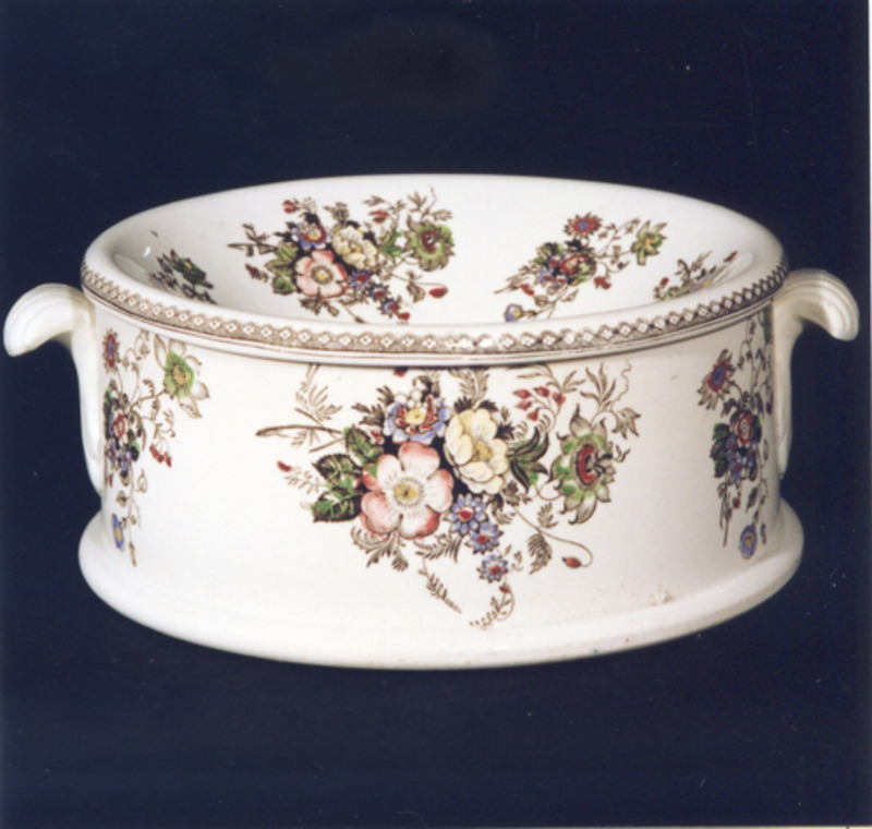 Completa a decoración nas bufardas, dobre orla de roleos e cadros separados por un campo moteado. Esta decoración foi copiada de modelos da fábrica inglesa "Copeland & Garret " (1833).
