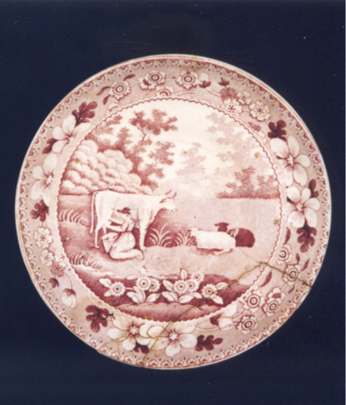 Prato pequeno para cunca de café ou té estampado en verde. O motivo central representa unha muller axeonllada muxindo unha vaca. Á dereita, dúas ovellas. A escena desenvólvese nun campo cheo de flores, arbustos e árbores. Ao fondo, coas tintas máis claras para dar profundidade, campo onde repousan tres ovellas.