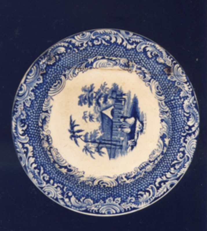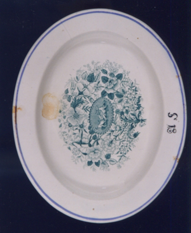 Fonte pequena ovalada decorada cun filete azul (non cobalto), estampacións en verde e as iniciais en negro.