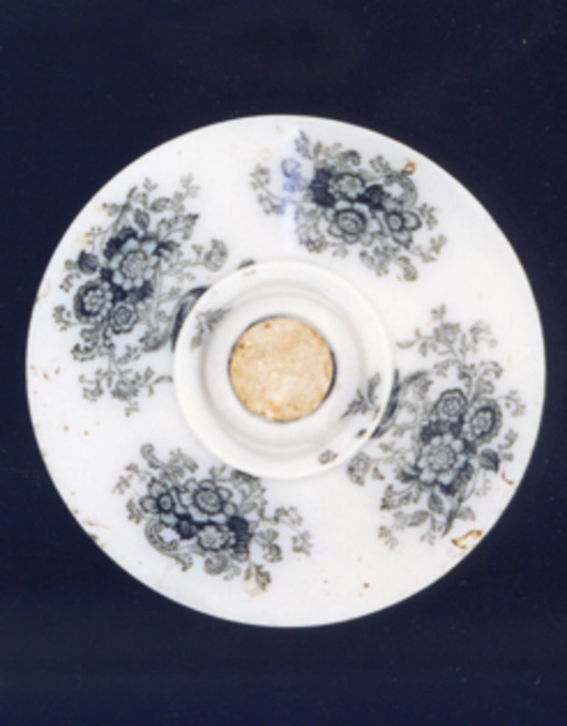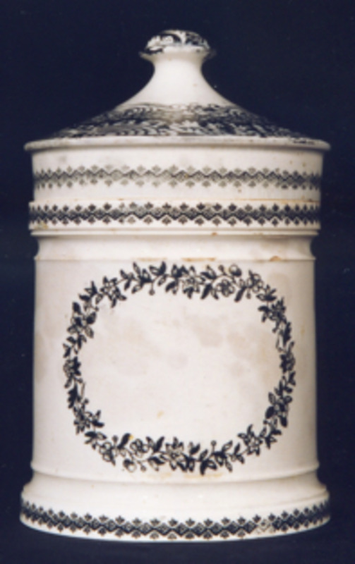 Frasco de forma cilíndrica, moldurado nos extremos superior e inferior. Tapadeira con remate en botón. Decoración de estampados en negro.