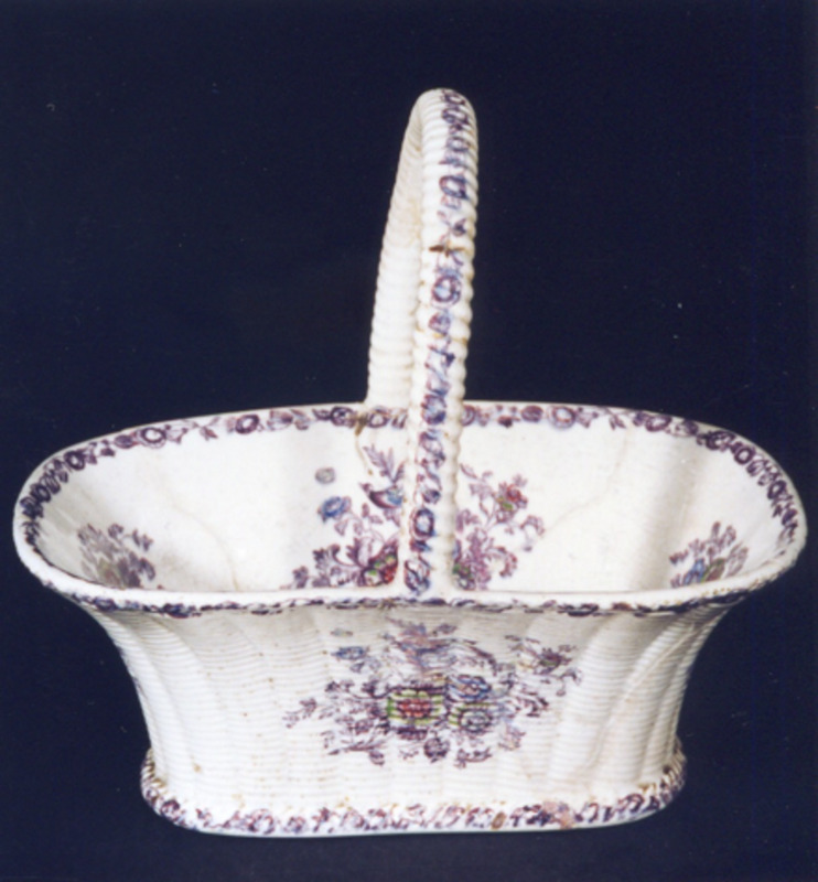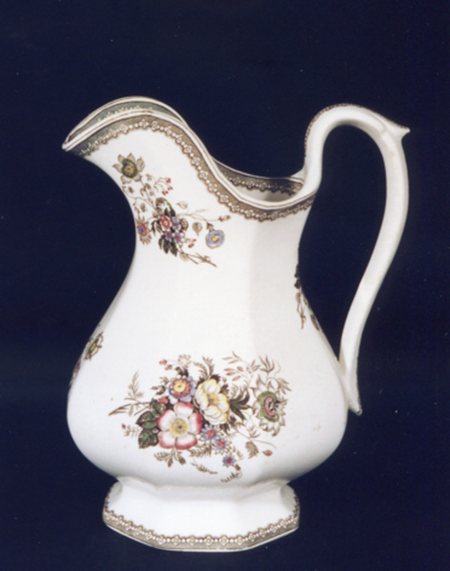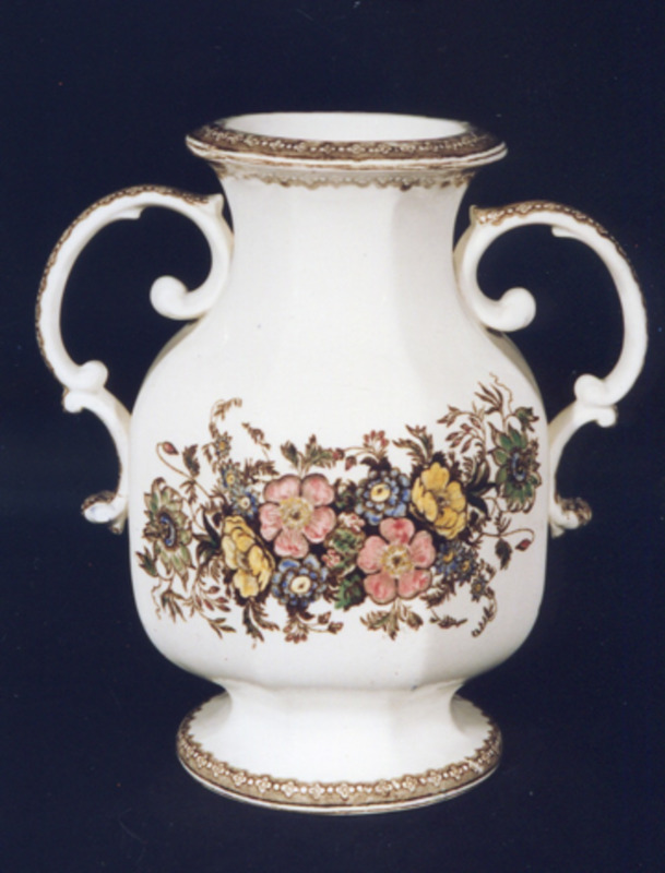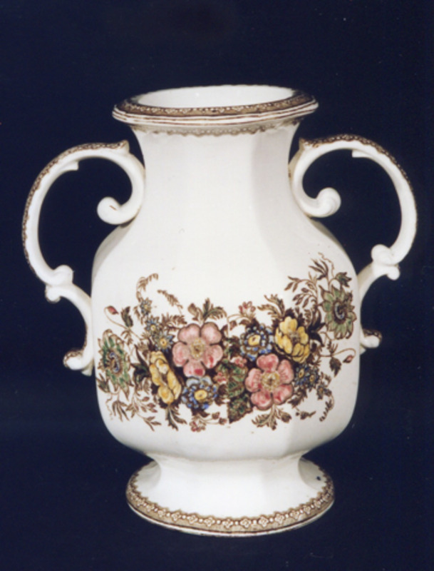 De forma oitavada-labiada. Ten dúas asas vexetais. Decoración a base de flores: rosáceas, herbáceas e pasiflora, estampadas en marrón e iluminadas en carmín, amarelo, verde e azul. Completan a decoración finas orlas marrons en base e boca, de rosáceas e perlas.