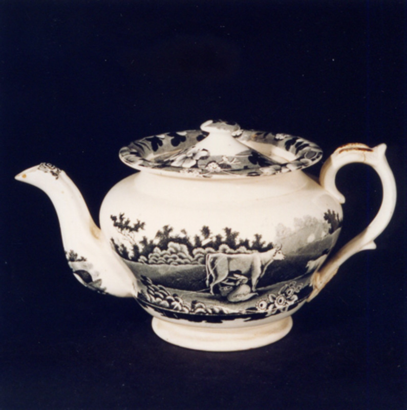 Teteira de forma redondeada. Tapa con agarradoira en forma de botón. Está decorada con estampacións en negro.