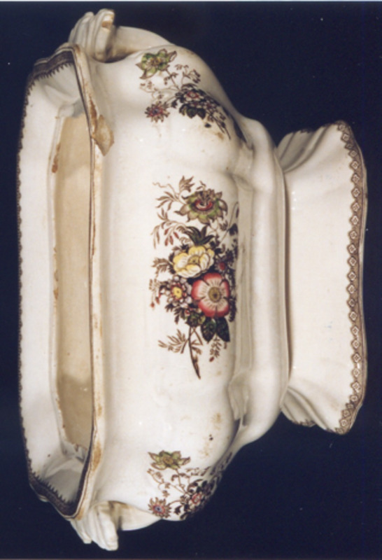 Fonte fonda, octogonal, con pé alto, dúas asas laterais labiadas, con motivos xeométricos e vexetais en relevo. Tapadeira con remate en flor. Decoración estampada en marrón.