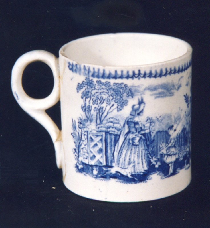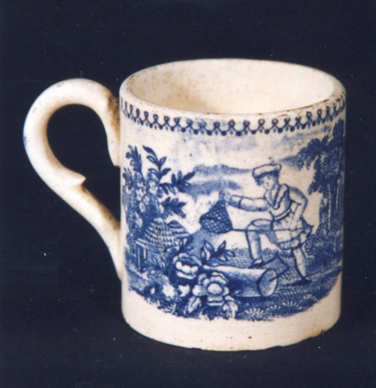 Cunca para chocolate de forma cilíndrica e decoración estampada en azul cobalto. Temas principais: dúas viñetas con temas infantís; un dos temas é un neno con cazabolboretas, ao lado de dous favos de abellas. Como fondo: referencia espacial dun xardín ou bosque, con árbores, plantas... Na boca, puntilla finita.