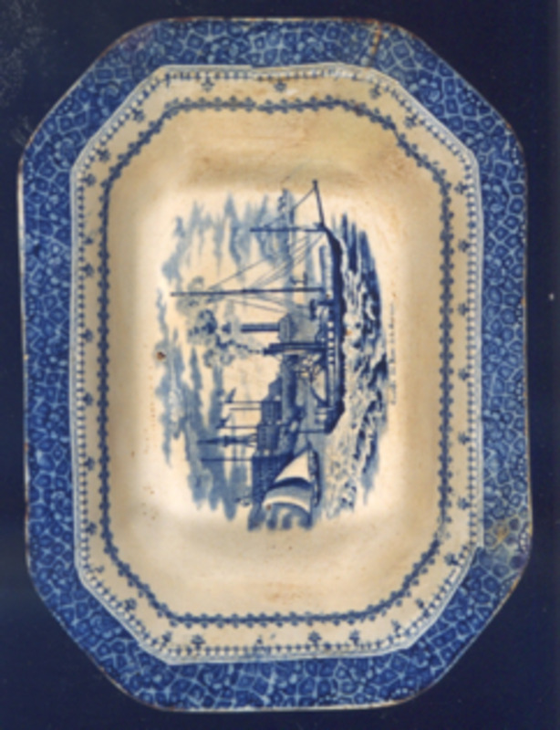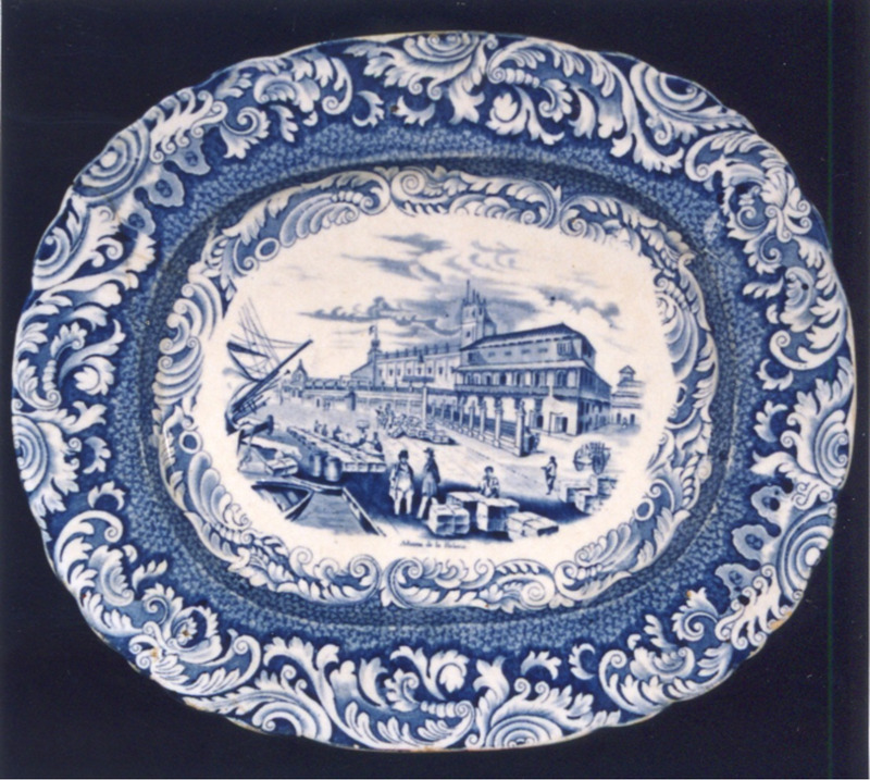 Fonte chaira de forma ovalada con bordo de ondas e estampacións en azul. O tema principal, no centro, é unha gran viñeta con paisaxe real e debaixo epígrafe "Aduana de la Habana". O tema está sacado dun gravado da época.