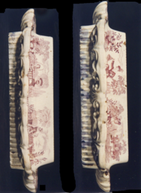 Completa a decoración, nas bufardas, dobre orla de roleos e cardos separadas por campo imbricado. Esta decoración está copiada directamente de modelos da fábrica " Copeland & Garret" (1833).