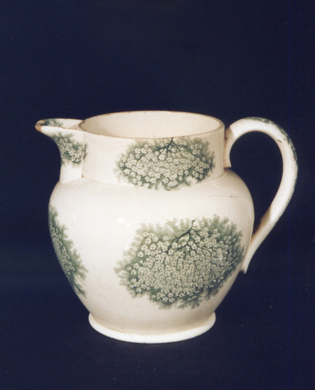 Xerra de pico e colo. Presenta decoración de estampados en verde consistentes en ramitos de flores miúdas coas súas follas que podería ser "breixo": o mesmo motivo se repite tres veces no bandullo e fragmentos do mesmo motivo aparecen colocados na asa, pico (parte interna e externa) e dous no colo.