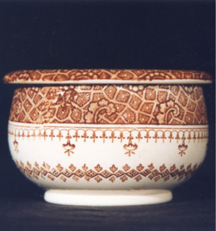 Oveira de dúas bocas (podía usarse indistintamente). Presenta decoración estampada en cor marrón a base de dúas orlas de flores silvestres: unha arriba e outra abaixo sobre campo sombreado, logrado a base de infinidade de puntos. Na parte interna as mesmas orlas e no bordo de ambas as dúas bocas remate puntillado.