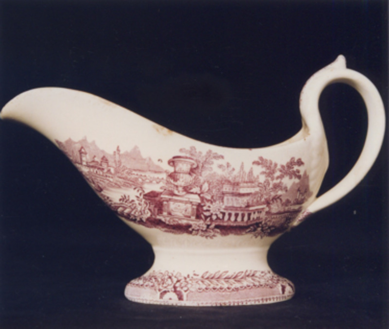 Salseira de pico e asa (actualmente desaparecida), decorada con estampaxes en marrón.