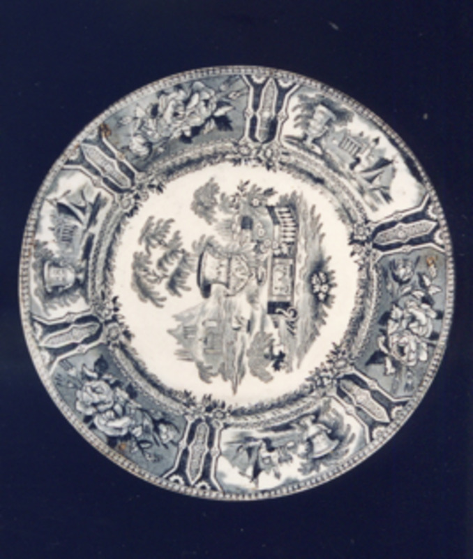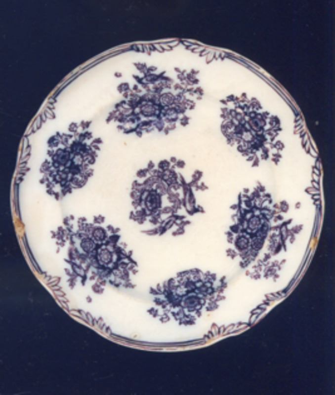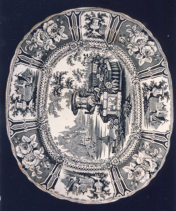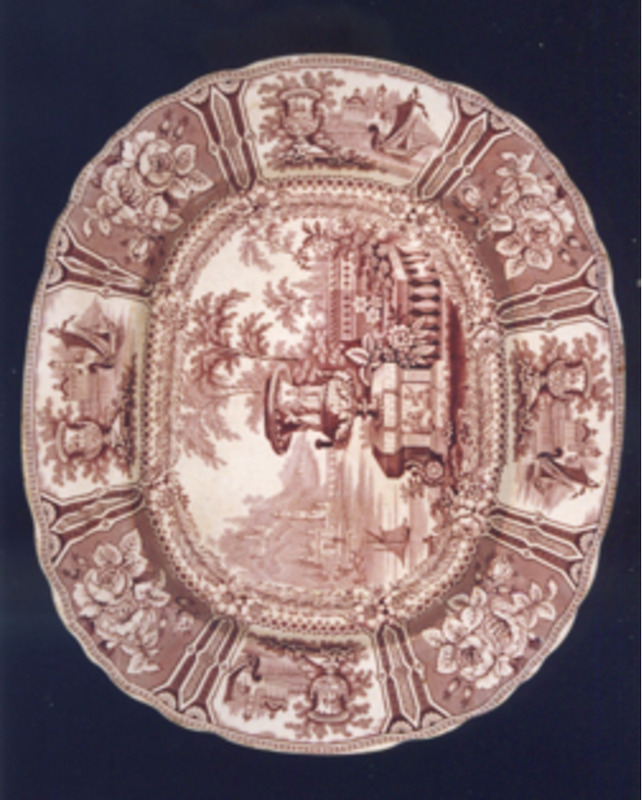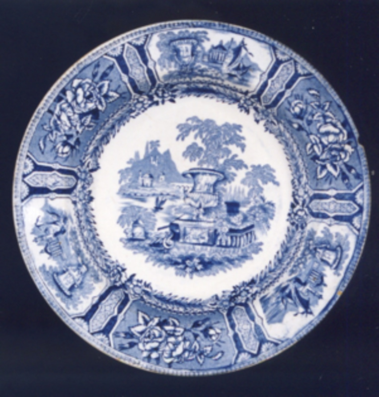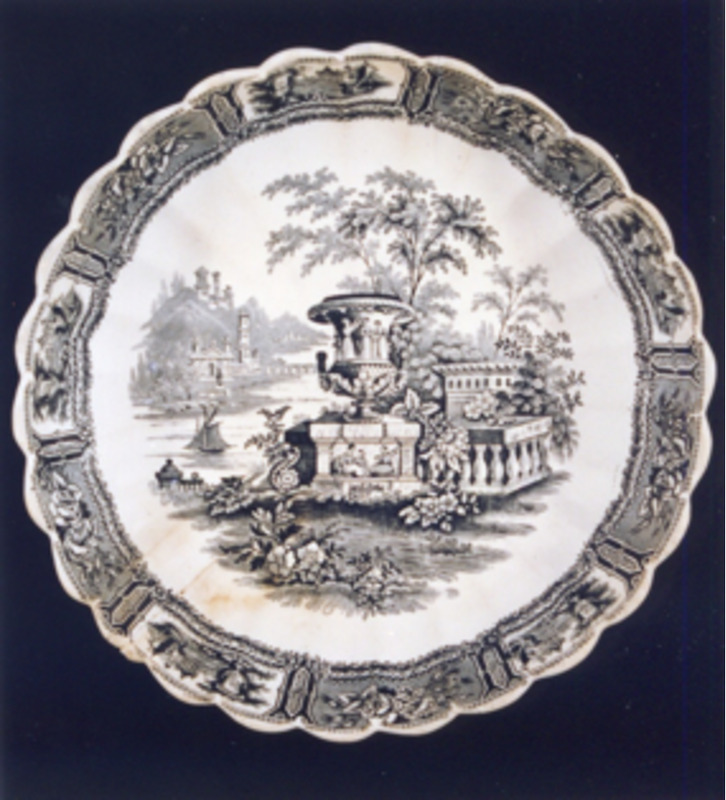 Prato de sobremesa con bordo ondulado. Decoración estampada en marrón tipo "xardíns ideais". O motivo central representa unha típica paisaxe victoriana e procede dunha prancha doutra fábrica inglesa. Está caracterizado pola presenza dun gran floreiro en primeiro plano, clásico; vexetación abundante, balaustres, escalinatas, unha góndola navegando sobre un río en zig-zag, a cuxo marxe esquerda ordénanse edificios, montañas e unha ponte.