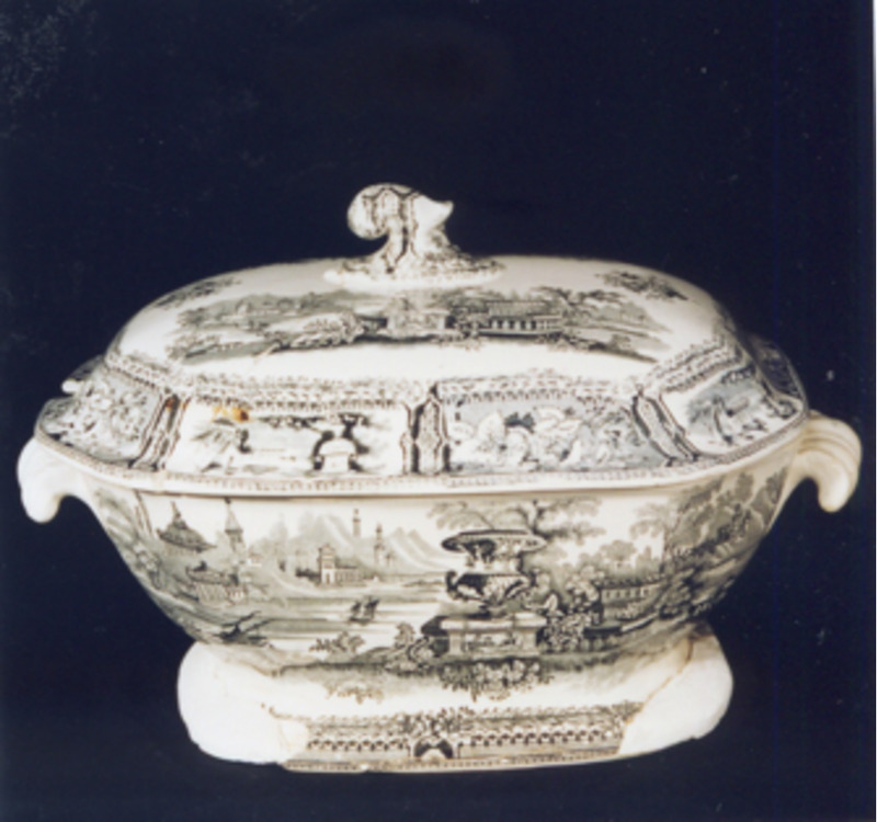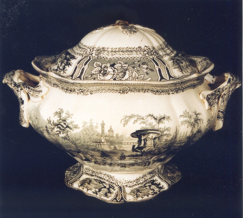Decoración estampada en negro a base dunha viñeta con xardín fantástico victoriano, que se repite dúas veces no corpo da sopeira e dúas na tapadeira. A paisaxe está caracterizado pola existencia dun gran floreiro de xardín en primeiro plano. Completa a decoración na tapa unha sucesión de viñetas con paisaxes "Góndola" e rosas. Completa con espiguillas e rosáceas, tamén na base e bordo interior da sopeira.