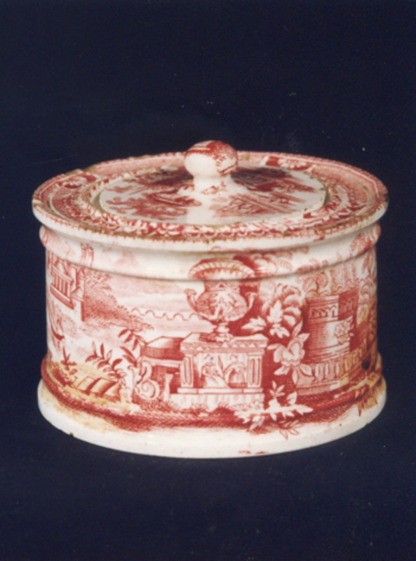 De forma cilíndrica con extremos moldurados. Tapa redonda con remate en bóla. Decoración estampada en vermello carmín rosado; no corpo, dúas paisaxes imaxinarias idénticas, unha a continuación da outra, tipo "Góndola", caracterizado pola presenza dun gran floreiro clásico, balaustres, abundante vexetación, río con góndola e edificacións pseudo-clásicas. Similar viñeta na tapadeira formando parte da mesma o botón. No bordo, espiguilla e rosácea en cenefa.
