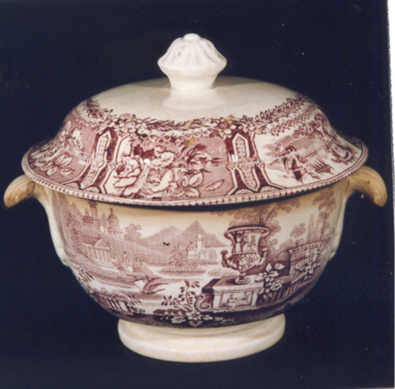 Decoración estampada en granate tipo "Góndola" (paisaxes ideais). O motivo principal, situado no centro da fonte procede dun modelo inglés: Trátase dun xardín victoriano caracterizado por un gran floreiro clásico en primeiro plano, balaustres, rica vexetación e unha góndola sobre o río. Ao fondo, edificios neoclásicos, montañas e unha ponte. Nas guardillas decoración de viñetas con igual paisaxe ao central pero en pequeno alternando con rosas.