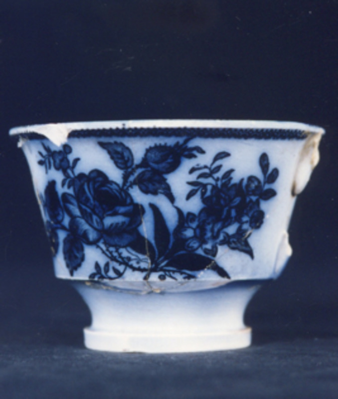 Cunca de té moi deteriorada e sen asa. Presenta decoración estampada en azul cobalto e impregnación do fondo de cor.